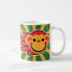 Ayez une boisson avec un singe rouge mignon avec un grand sourire et de grandes oreilles de singe, et fait de la forme d'une main, sur un starburst coloré.