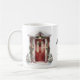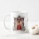 Cette tasse unique présente une charmante porte d'entrée à l'aquarelle ornée de verdure de Noël, avec une couronne faite de cônes de pin, de baies et de feuilles au centre. Au-dessus de la porte, une guirlande de la même verdure cascade sur les côtés, encadrant la porte avec un nœud rouge profond. La porte elle-même est d'une teinte rouge profonde et riche. Deux arbres verts blancs givrés se dressent de chaque côté de la porte. La scène est placée sur un fond de sol doux recouvert de neige. L'effet global est chaleureux et accueillant, évoquant l'esprit convivial de la saison des fêtes pour montrer votre appréciation.