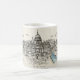 Dessin stylisé d'un paysage urbain avec différents bâtiments, un dôme central et un pont sur l'eau.