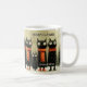 Mug featuring a whimsical painting of a row of cats in winter outfit. On the left is a lantern and on the right a Christmas tree.