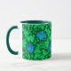 Tasse à café dans un motif vintage William Morris floral damassé fleurs et feuilles d'anémones, numériquement rehaussée et colorée - feuilles vert émeraude, et fleurs dans les nuances de cerulean et bleu cobalt sur un arrière - plan vert émeraude foncé