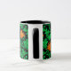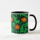 Tasse de café dans un vintage motif de damas florales William Morris de fleurs et de feuilles d'anémones, numériquement rehaussés et colorés - feuilles vert émeraude, et fleurs dans les tons de mandarine profonde orange et or sur un arrière - plan noir
