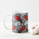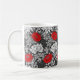 Tasse à café dans un vintage William Morris, Art Nouveau, imprimé floral de chrysanthèmes stylisés, numériquement rehaussés et colorés, dans les tons gris argent/gris et blanc, accentués de rouge profond, sur un arrière - plan gris graphite foncé