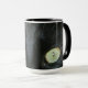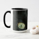 Un gros plan photographique du visage d'un chat noir placé sur la tasse pour qu'un oeil regarde de droite, l'autre de gauche. Les points saillants de la fourrure définissent les yeux et le nez.