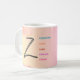Cette tasse sera un favori pour tout le monde, de votre petite-mère douce à votre soeur adolescente. Avec le bon message, un mug peut devenir le compagnon précieux de n’importe qui pour les années à venir. Ce design présente une belle lettre "Z" dessinée à la main en noir cursif sur un arrière - plan d'aquarelle étonnant. Le côté gauche présente un dégradé chaud de jaune à rose, tandis que le côté droit affiche un dégradé doux de rose à jaune. Autour de la lettre sont des mots vibrants de différentes couleurs, dont le bleu, l'orange, le rouge, le violet et le rose, mettant en évidence des traits positifs commençant par la lettre "Z". L'effet global est un design visuellement attrayant et stimulant qui célèbre la beauté de la lettre "Z" et ses qualités associées. L'arrière - plan aquarelle ajoute une touche d'élégance et de sophistication, ce qui rend ce design parfait pour des raisons d'inspiration ou de motivation.