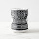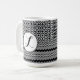 La partie supérieure de votre tasse est recouverte d'un motif de médaillon rétro extensible aux formes diamant concaves à l'intérieur, et le fond a des rangées de zigzags de différentes épaisseurs. Au centre des lieux où se rencontrent les motifs se trouve un médaillon en cercle blanc avec une bordure en pointillés noir et blanc. C'est un espace pour votre monogramme. Changez la lettre à ce que vous voulez. Vous pouvez également modifier la police du monogramme si vous le souhaitez.