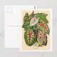 A fine art botanical postcard with an illustration of multi-coloured caladiums in red, green and white.