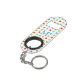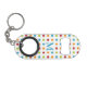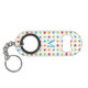 Multi-coloured polka dots on personalized mini bottle opener keychain.