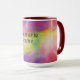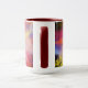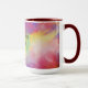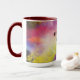 A burst of colour two toned coffee mug with maroon interior and handle. "WAKE UP TO COFFEE"