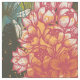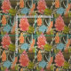 An abstract African botanical pattern in shades of orange, red, blue and green on a dark background.