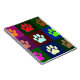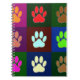 A colourful dog paw print pattern in pink, orange, blue, yellow and other colours.
