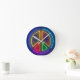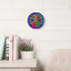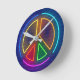Graphic of a multicolored neon peace sign symbol against a brick wall background