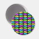This magnet features a series of different coloured cartoon style pigs. Each has its head down ready to gobble up whatever food it can find. The hogs are in alternating lines of green and yellow and purple and blue. The background is black.