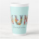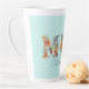 Beautiful latte mug features watercolor floral letters that spell out M-U-M with customizable "extraordinaire" in modern script, on pastel blue background
