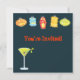 A dancing tipsy Mummy invites you to his Halloween Cocktail party with Jack-o-lanterns and creepy cocktails complete with eyeballs and spider. Plenty of room on both decorated sides for you party info. Hand drawn illustration by McBooboo.