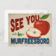 A charming Murfreesboro Tennessee vintage travel postcard featuring a lovely red apple, along with fun retro style text that says, "See you in Murfreesboro"