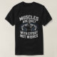 This black t-shirt features the text "MUSCLES ARE BUILT WITH EFFORT NOT WISHES" in a bold, stylized white font with a blue outline. The words are arranged around a central graphic of a muscular individual, who appears to be a light-skinned man, performing a barbell row. The background has a textured blue and grey design, suggesting a gym setting. The design promotes hard work and effort in building muscle.