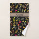 This lovely country chic hand towel has a black background with mushrooms in pink, orange and green. Interspersed are sprigs of foliage in greens and grey. Bright green beetles and orange snails give this design a whimsical tone. The towel can be personalized with your choice of a name or initials.