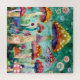 A vibrant forest of whimsical, multicolored mushrooms rises against a swirling green backdrop. The scene is dotted with various-sized fungi, each capped with speckles and surrounded by delicate floral elements.