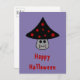 A cute cartoon mushroom vampire on a purple background with "Happy Halloween" in red.