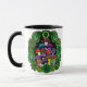 A mug with colourful psychedelic mushrooms surrounded by green paisley and green mandalas.