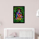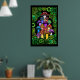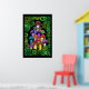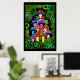 A poster with colourful psychedelic mushrooms surrounded by green paisley and green mandalas.