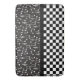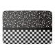 Fun bath mat design has a '50s diner jukebox vibe with the top panel of jumbled white musical notes on black background and a black and white chequerboard pattern bottom half.