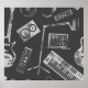 music, pattern, production, seamless, dj, vintage, illustration, piano, guitar, symbol, microphone, keyboard, sound, record, equipment, background, silhouette, amplifier, audio, grunge