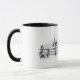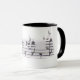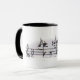 White mug with black handle, and a musicial theme.