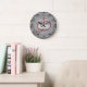 Designer music clock in silver gray and deep wine red showing a treble clef musical symbol in red and musical eighth notes for each of the hour markers. Great silver gray background striped like musical notation sheets with an updated contemporary look. Beautiful gift for music schools, music students, musicians, music lovers, clubs and music teachers. Perfect music themed clock for anywhere bands and musicians practice or perform. CricketDiane Designer / Artist 2017 and Cricket House Studios Art and Design. (2016 design remix)