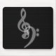 A classy simple black/white music themed mouse pad - white treble and bass clefs against a textured black background. Music Love.