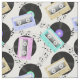 Retro music vinyl records and cassette audio tapes from the 80s with music notes.