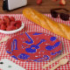 This design is a mix of different musical instruments in blue and white with a red background. Also available a different size and matching napkins with the same design. This image is available on a variety of other products, just click the link below the photo near 'About this Design'.
