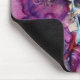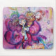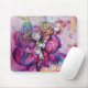 Colorful, whimsical,funny pink clown playing bugle with an expressive owl and joyful musical notes,flowers,leaves in vibrant red,fuchsia,violet,purple,blue,white colors, watercolor painting by Bulgan Lumini (c)