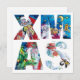 Colourful alphabet letters , whimsical artistic Christmas monogram design with original acrylic paintings ,Snowman ,and Penguin's serenade , Santa Claus playing violin in the snowy winter night ,yellow moon,stars,an owl ,floral ornaments,winter plants,Christmas tree, balloons, holly berries in bright red,green,white,blue,yellow colours.