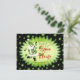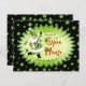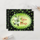 Green stars and musical notes with a jolly musical Santa Elf playing the banjo on a fun Christmas open house invitation. Open house information on card back may be personalized in template provided.
