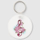 Pink treble clef with delicate, detailed pink Japanese cherry blossoms against white background painted over with light blue paint. Blooming pink sakura.
