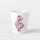Pink treble clef with delicate, detailed pink Japanese cherry blossoms against white background painted over with light blue paint. Blooming pink sakura.
