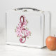 Pink treble clef with delicate, detailed pink Japanese cherry blossoms against white background painted over with light blue paint. Blooming pink sakura.