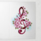 Pink treble clef with delicate, detailed pink Japanese cherry blossoms against white background painted over with light blue paint. Blooming pink sakura.