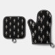 Cute oven mitt and pot holder set, with a simple white treble clef pattern on a black background. A fun musical item to add a touch of classical music to your kitchen and cooking supplies.