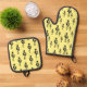 Cute oven mitt and pot holder set, with a simple treble clef pattern on a yellow background. A fun musical item to add a touch of classical music to your kitchen and cooking supplies.