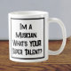 Drôle slogan sur une tasse de café qui dit "Je suis un musicien. Quel est VOTRE super talent ?" Café Mug pour un musicien ou quelqu'un qui joue de la musique ou écrit de la musique. Texte en gras noir et blanc.