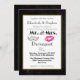 Un faire-part de mariage de style moderne avec des lèvres kissy roses et une illustration de moustache rétro. Placez-vous sur un arrière - plan en damier noir dans un cadre bordé d'or. Personnalisez avec tous vos détails mariages.