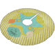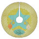 Pretty in cream, mustard, aqua, and orange, this personalized holiday tree skirt features a background of mustard and cream diagonal stripes with white polka dots on mustard, a big aqua blue star, and four ornaments with a banner you can easily personalize with your family name.