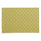 Pattern of white polka dots on a mustard yellow background. The dots are evenly spaced, creating a simple, vintage, playful aesthetic.