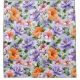 Muted watercolor style flower pattern of pink, orange, lavender flowers with green leaves on a mint background.