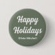 This elegant green - grey coloured button is the perfect way to add a touch of festive cheer to your holiday outfit. The text "Happy Holidays" is customizable and also the name can be personalized.