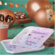 These paper plates includes drawings of two winged angels along with the party details such as the date of the celebration. This also features a magical or fairy tale theme, with decorative elements such as cake, crackers, or wrapped gifts. Overall, these are designed to convey a sense of joy and wonder, inviting guests to join in your celebration. With its playful design and script, it sets the tone for an unforgettable celebration that your guests won't want to miss. And with its high-quality printing and attention to detail, it's a true work of art that you'll be proud to display at your celebration.