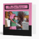 Retro fifties design. Black and pink colours. Illustration is of a fiifties' woman in pink dress and green apron. She's burned something and smoke is billowing out of the oven She's looking horrifies and trying to put out the fire. At the top is a box framed in black which says "My Best Recipes"